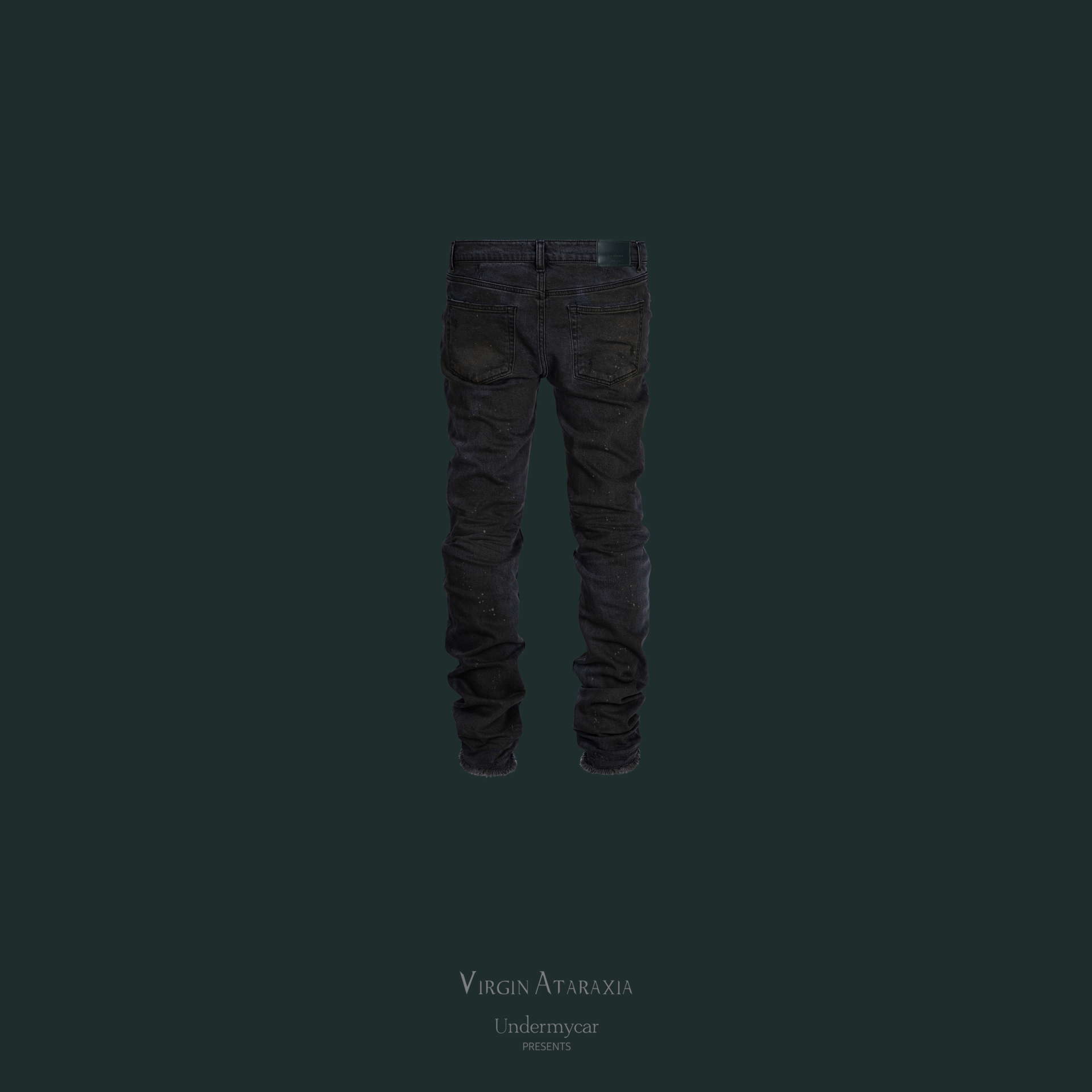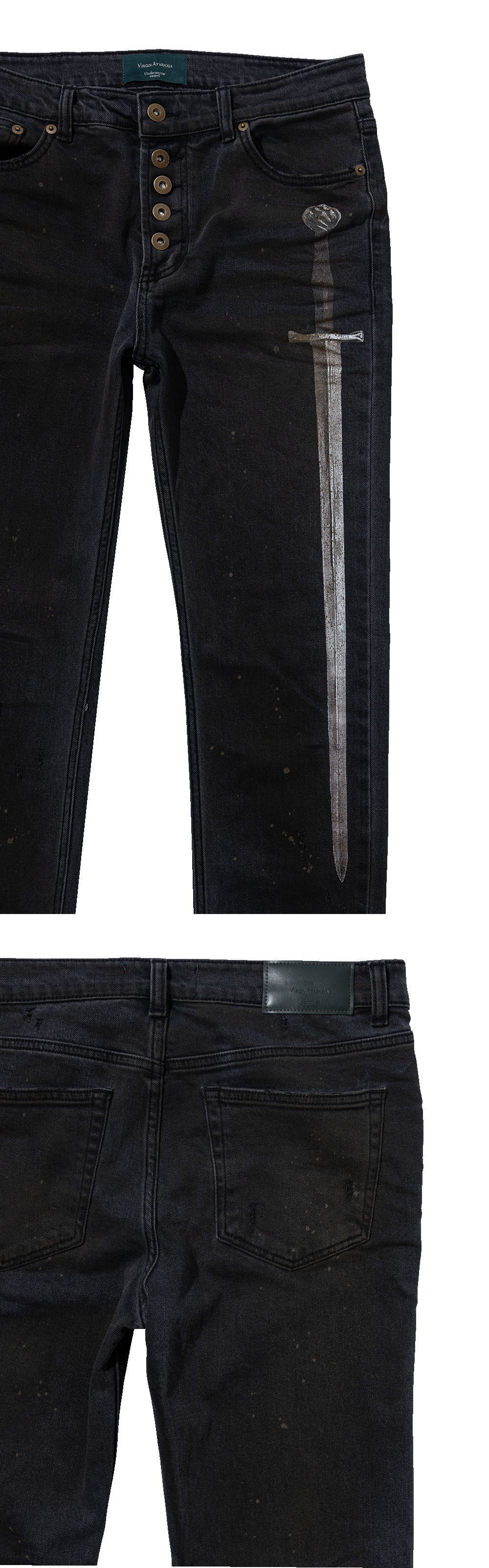 It is a witty denim piece with a life-size blade artwork printed on the front of the pants.