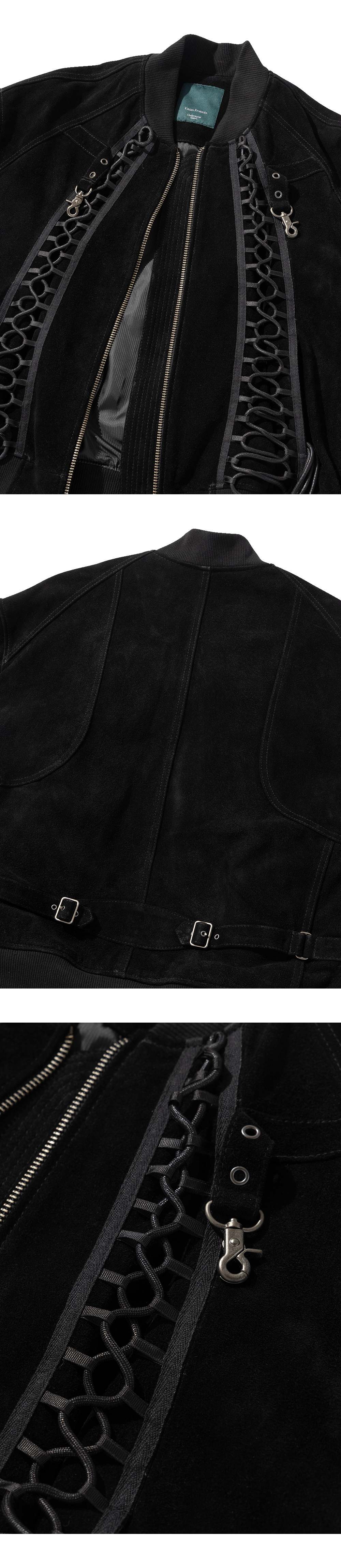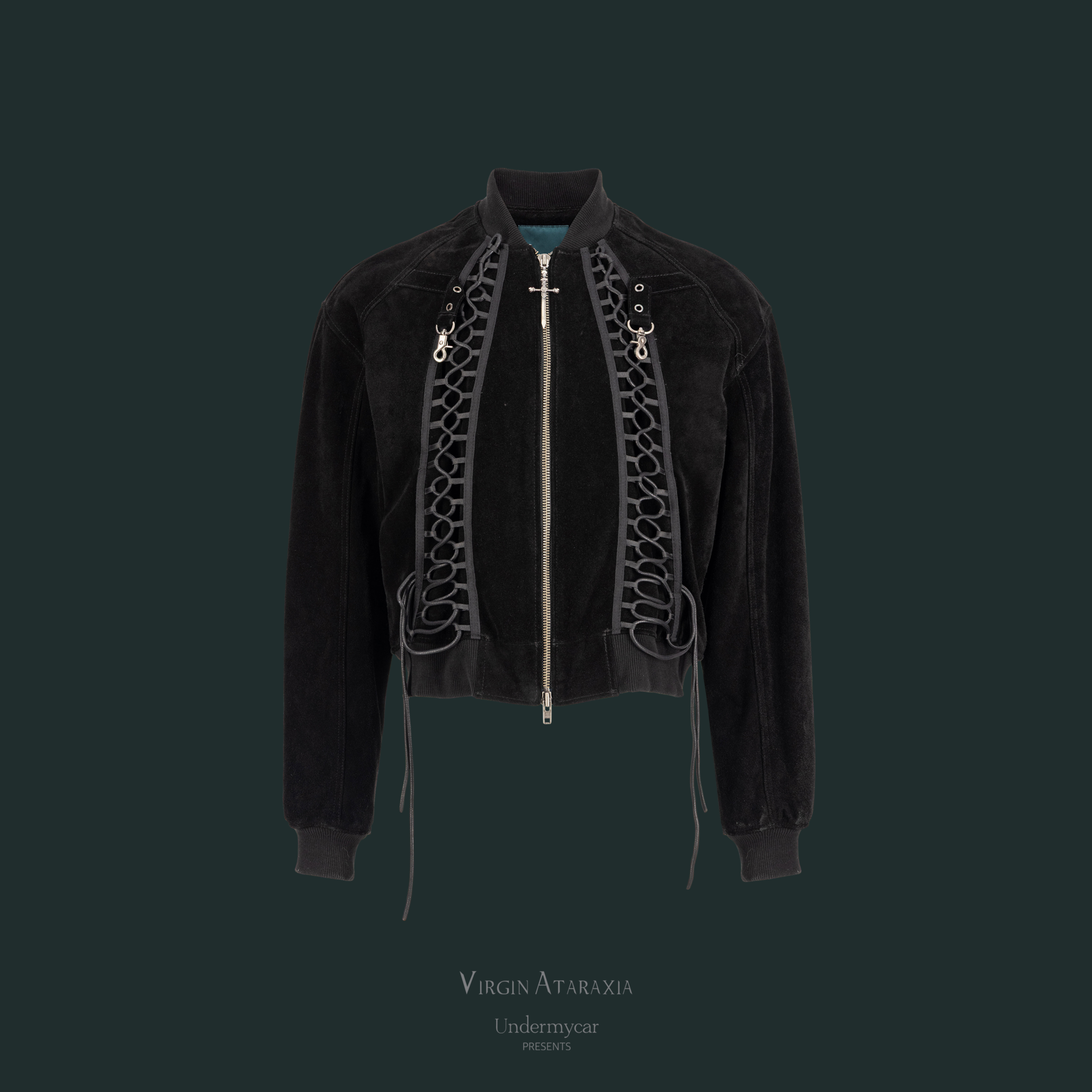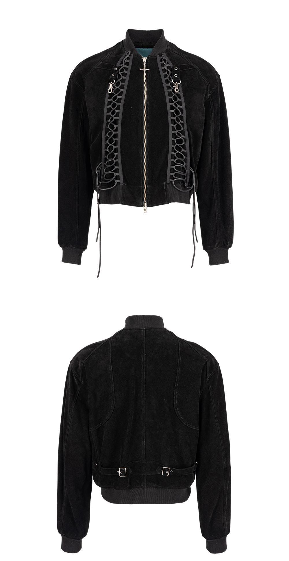 This suede blouson evokes the chainmail armor of Joan of Arc, featuring a front sword pendant crafted in 925 silver and corset-inspired detailing.