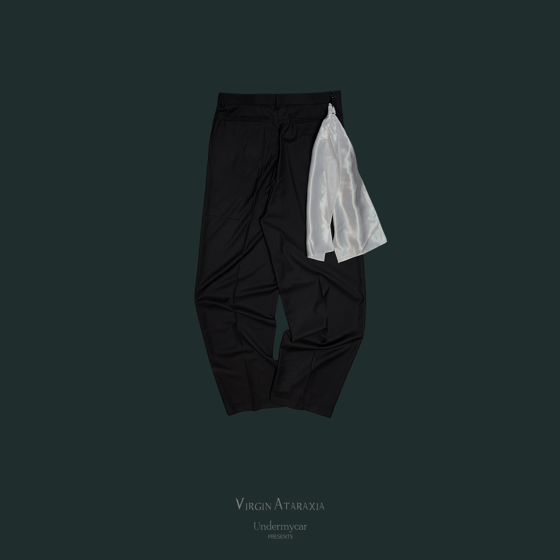 Wide-fit striped slacks featuring an integrated satin scarf,