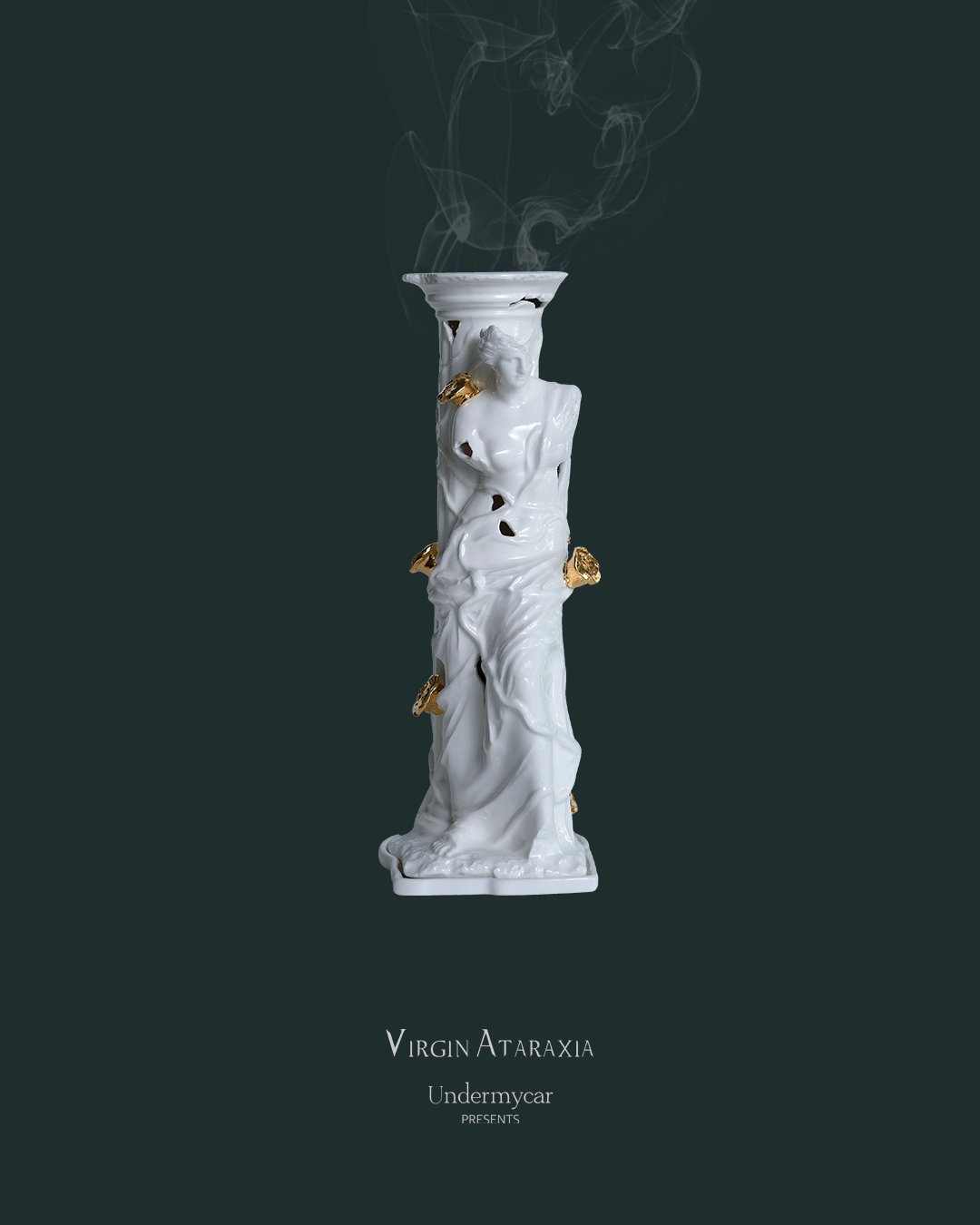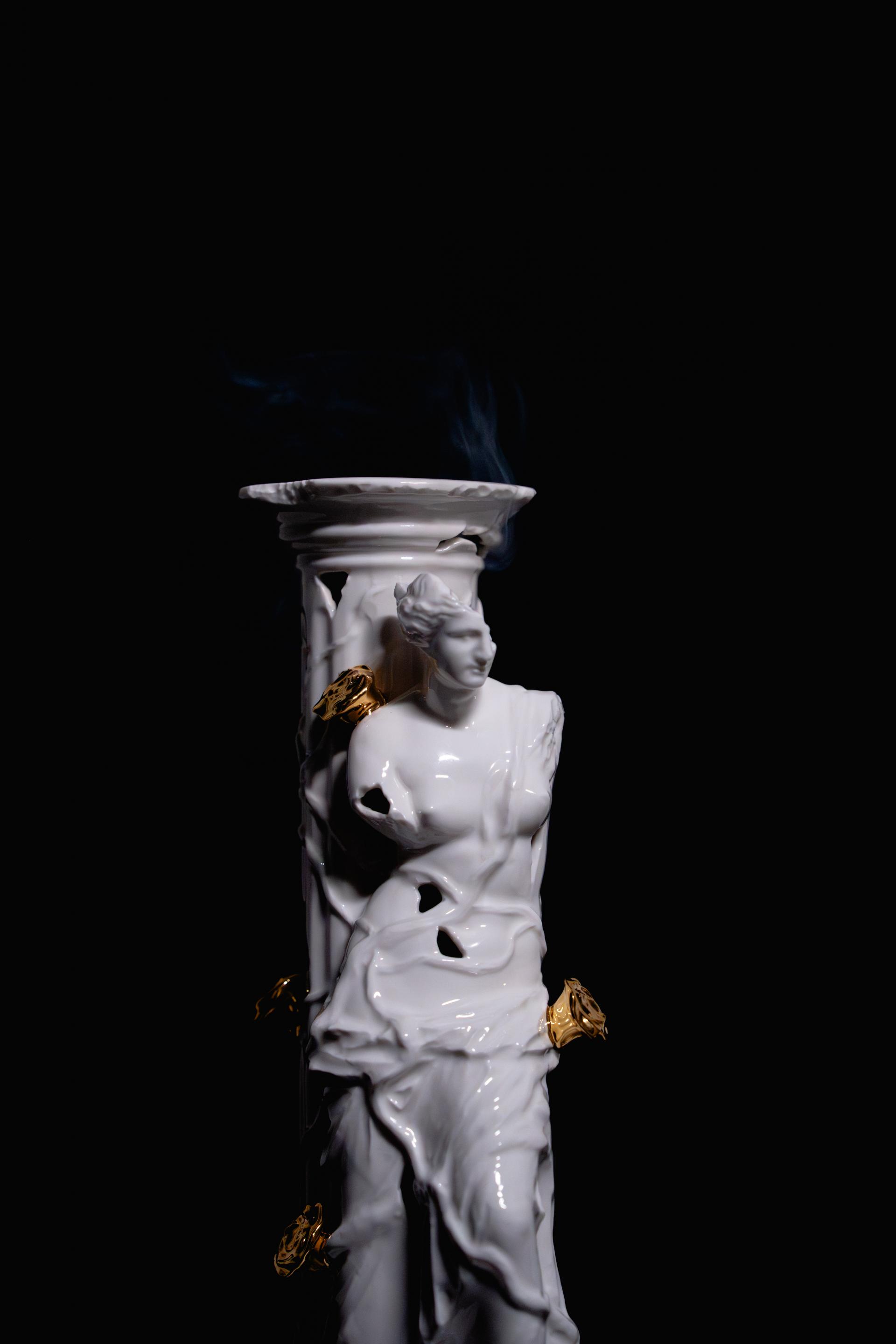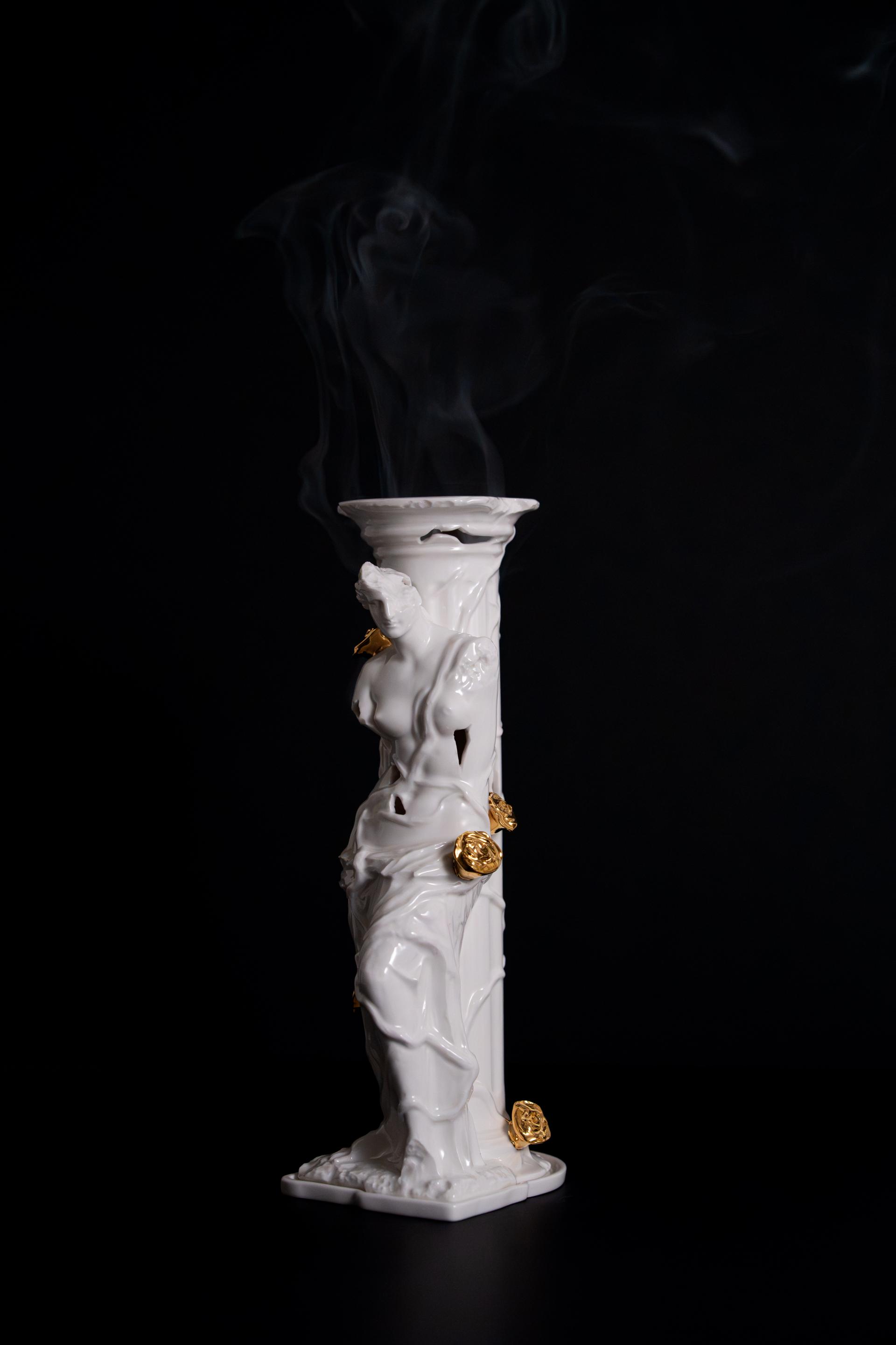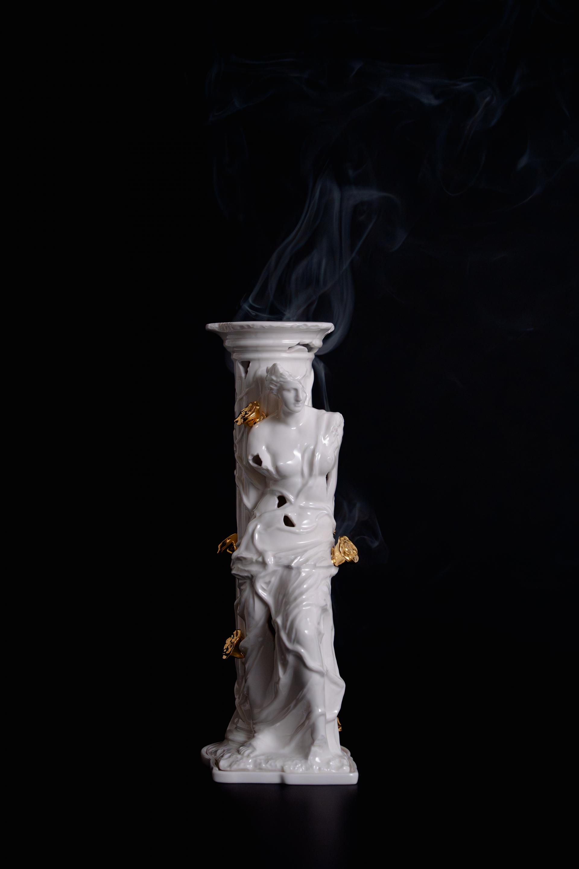 An objet-style incense chamber featuring a crumbled female statue crowned with a blooming gold rose.