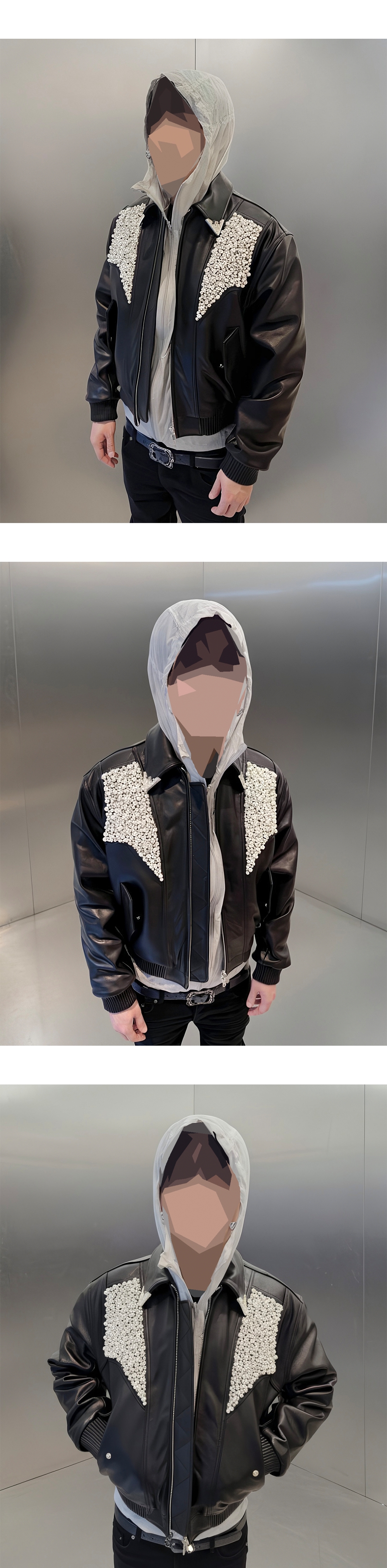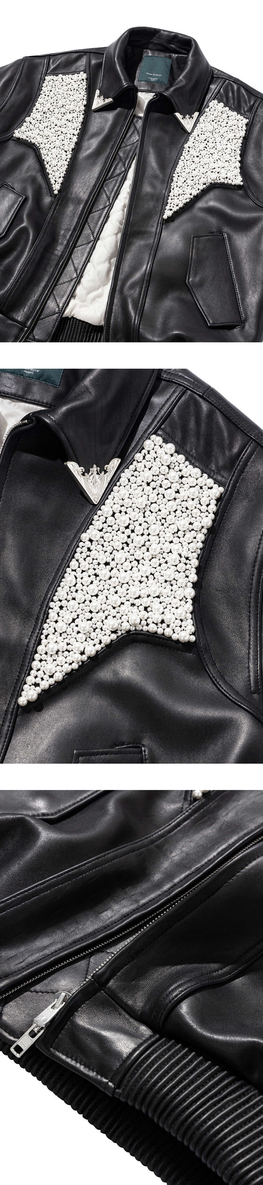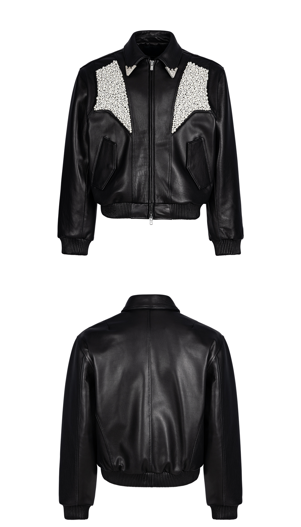 A lambskin blouson adorned with a 925-silver carabiner and hand-woven pearls.